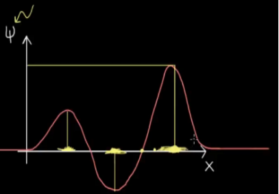 Dalga boyu genliğinin en yüksek olduğu kısım, ise elektronun bulunma olasılığının en yüksek olduğu kısımdır. Yüksek diye, her zaman burada olmaz herhangi bir zaman aralığında ölçüldüğünde sıfır hariç her yede olabilir. Olay tekrar tekrar yapılırsa bulunma olasılığı en fazla olduğu yer dalga boyunun en yüksek olduğu yerdir.